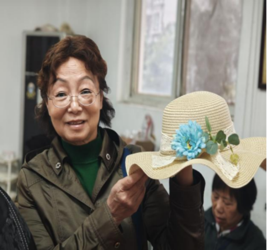 花艺草帽DIY是本次活动的核心内容。工作人员从草编草帽的基础造型讲解,到干花、仿真花的色彩搭配技巧,再到花艺固定的实操方法,进行了细致讲解与分步演示,将美学设计理念与手工实操技巧融入每一个教学环节。活动现场,居民们手持材料包,认真挑选花材、构思造型,细致修剪粘贴、点缀装饰,神情专注、巧手灵动,将对生活的热爱与独特的审美巧思,尽数融入每一件花艺草帽作品之中。社工全程穿梭现场,一对一解答创作难题、指导固定技巧,现场形成了互帮互助、交流共进的浓厚氛围。