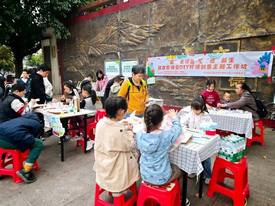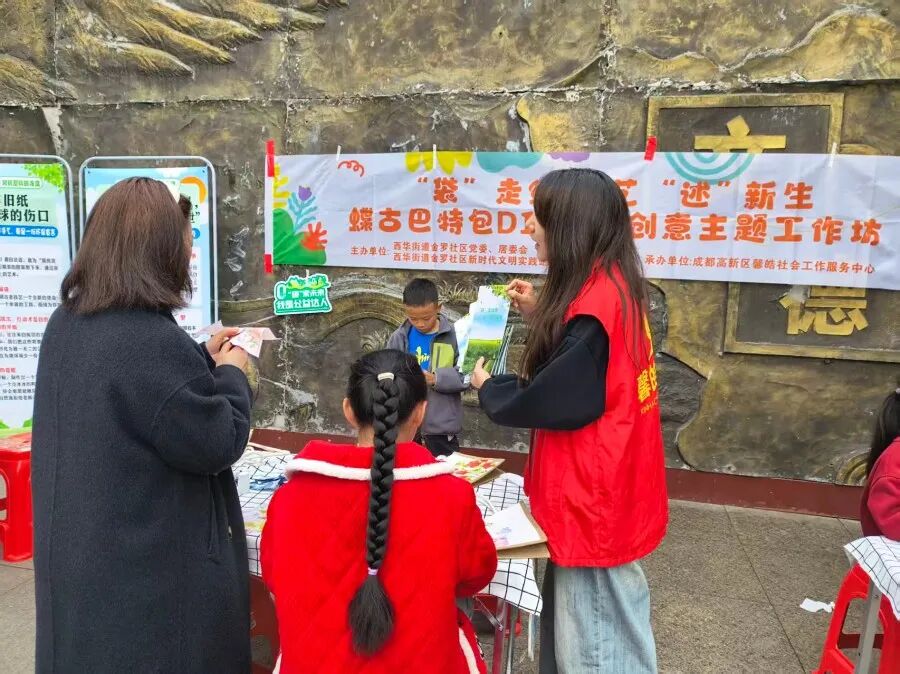 2026年3月29日下午,由金牛区西华街道金罗社区主办、成都高新区馨皓社会工作服务中心承办的“‘袋’走绿色·艺‘述’新生”蝶古巴特包DIY环保创意主题工作坊,在兴盛世家A区广场举行。活动吸引辖区20组亲子家庭参与,通过“环保微课堂+互动游戏+蝶古巴特创意改造”的形式,帮助居民在动手实践中掌握环保知识与技能,提升参与社区环境治理的能力。
