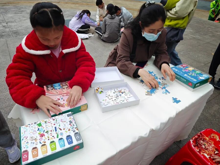 活动伊始,社工结合图文并茂的环保微课堂和三块科普KT板,向居民系统讲解塑料污染的严峻现状。从全球每年生产的塑料中一半仅用于一次性用途,到一个塑料瓶完全降解需400年以上、微塑料已进入人体血液等数据,直观的内容让家长与孩子对塑料污染的危害有了深刻认识,也让大家意识到减少一次性塑料制品使用的必要性。随后开展的垃圾分类拼图、环保知识问答等互动游戏,进一步巩固了所学知识,居民们在踊跃参与中提升了垃圾分类与环保认知的实操能力。