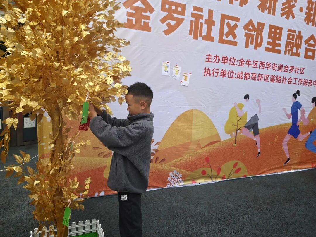 活动现场,喜庆温馨的音乐与精心布置的打卡背景板、许愿发财树相映成趣。居民签到后纷纷提笔书写心愿,将真挚祝愿挂上许愿树,寄托乔迁新居的喜悦与对未来生活的期许。在“邻里画像共创”环节,大家领取画像卡,用画笔描绘心中邻居的模样,共同完成了一面充满温度与仪式感的邻里打卡墙。一张张画像,既是初次见面的友好印记,也勾勒出多元群体和谐共融的生动图景。