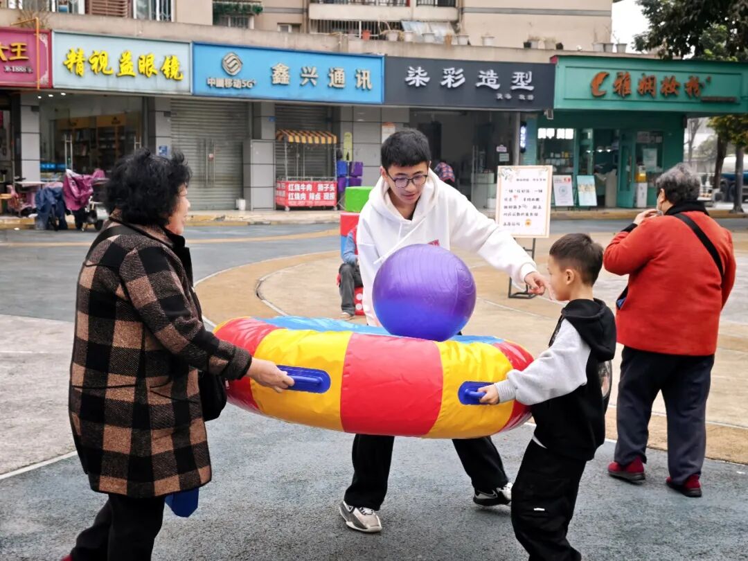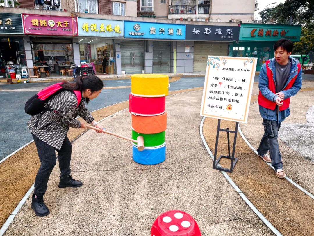 游园互动区欢声不断。精心设计的“搬家大作战”模拟真实搬家场景,新老居民随机组队,两人合力运送“包裹”,在默契配合中迅速拉近距离。“锤”住好运游戏让大家在抛掷骰子、敲击道具的轻松氛围中收获开怀;而“绿投精准·邻里同心”竹筒投球挑战,采用天然竹材与麻绳道具,传递“弃塑简朴、回归自然”的绿色生活理念,让居民在趣味互动中感悟低碳环保的社区新风尚。每一个游戏点位,都成为邻里相识的契机,也是一场社区认同的共建实践。