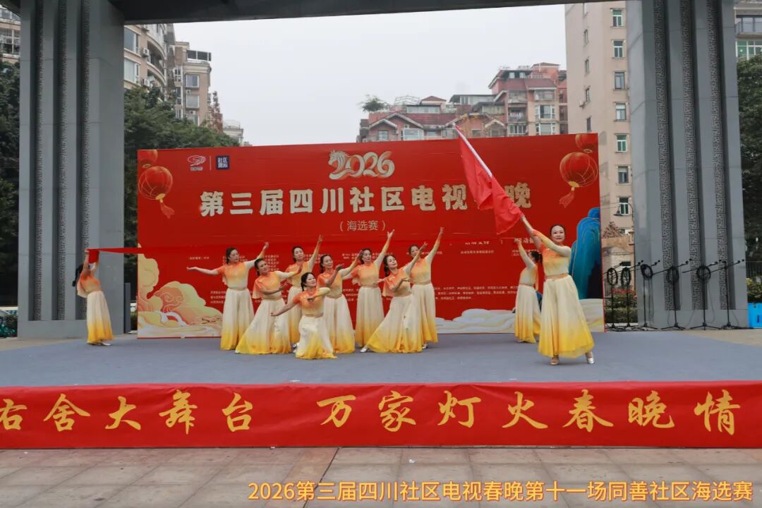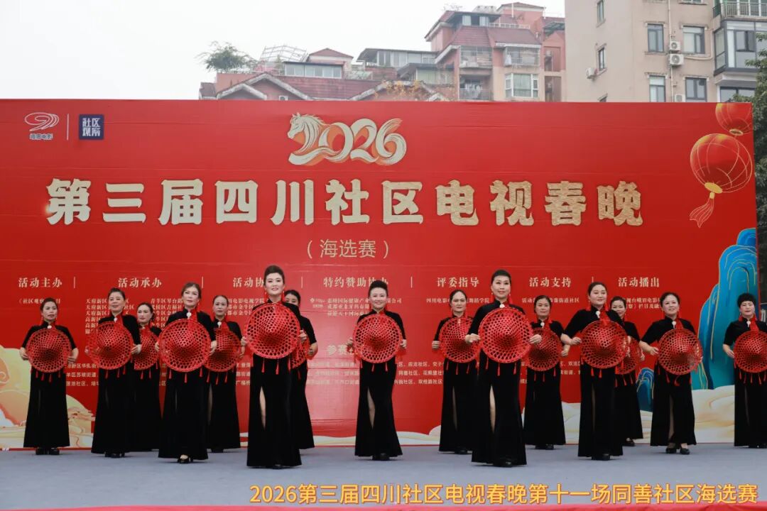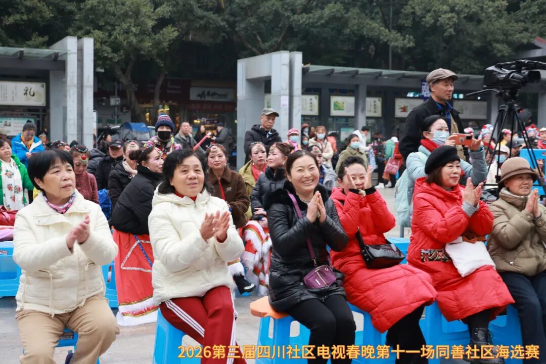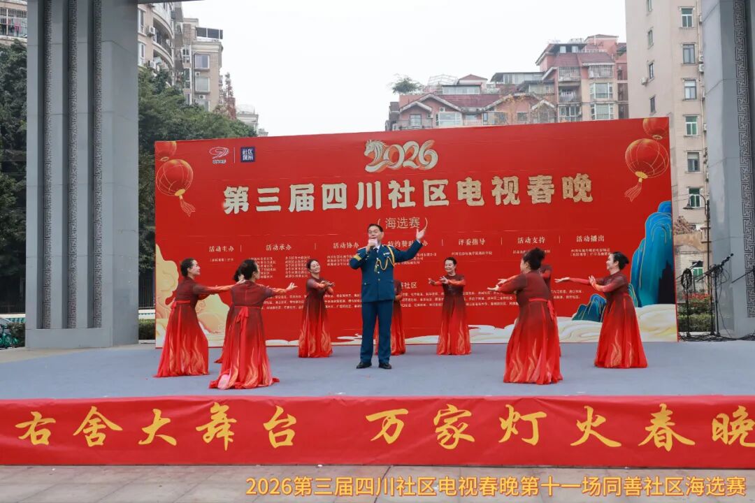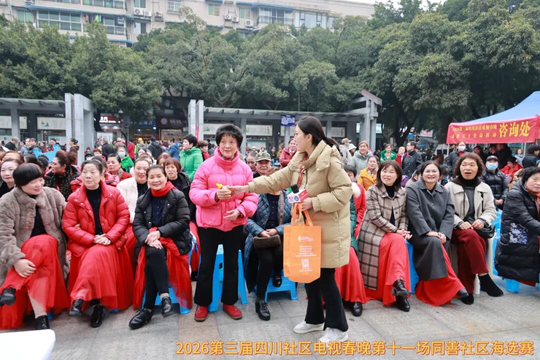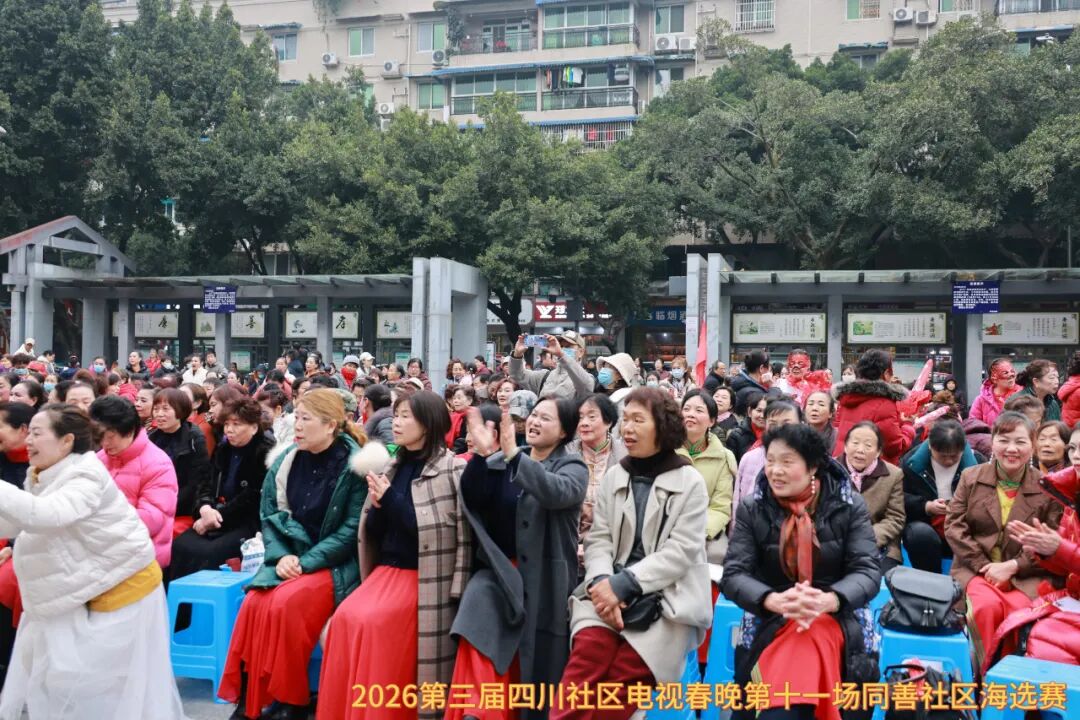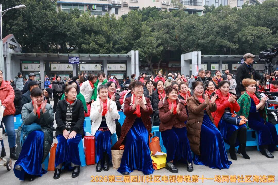 冬日的蓉城,天空虽蒙着一层薄纱,气温微寒,但人心向暖。12月19日下午,金牛区同善社区黄忠文化广场,却被一股扑面而来的热浪所包围。这里,2026第三届四川社区电视春晚第十一场社区海选赛正隆重上演。来自武侯区、锦江区、成华区和金牛区四个区域的24支优秀文艺队伍,近400名怀揣梦想的社区文艺爱好者齐聚于此。他们用歌声驱散阴霾,用舞步丈量热爱,与现场约300名社区邻里共同烹制了一席从午后延续至傍晚的文化盛宴,历时四个小时,将社区舞台的温度,烙印在每个人的心里。