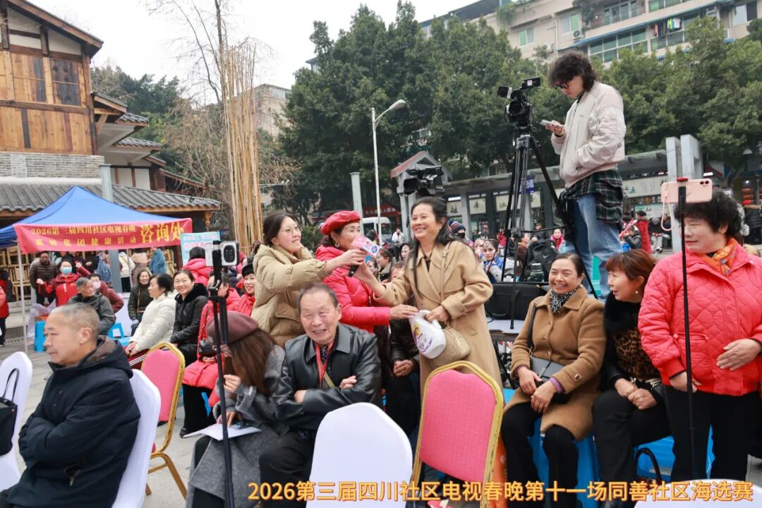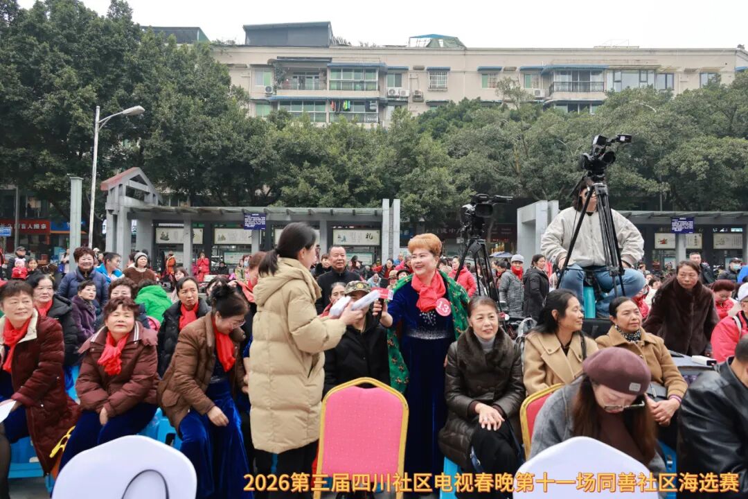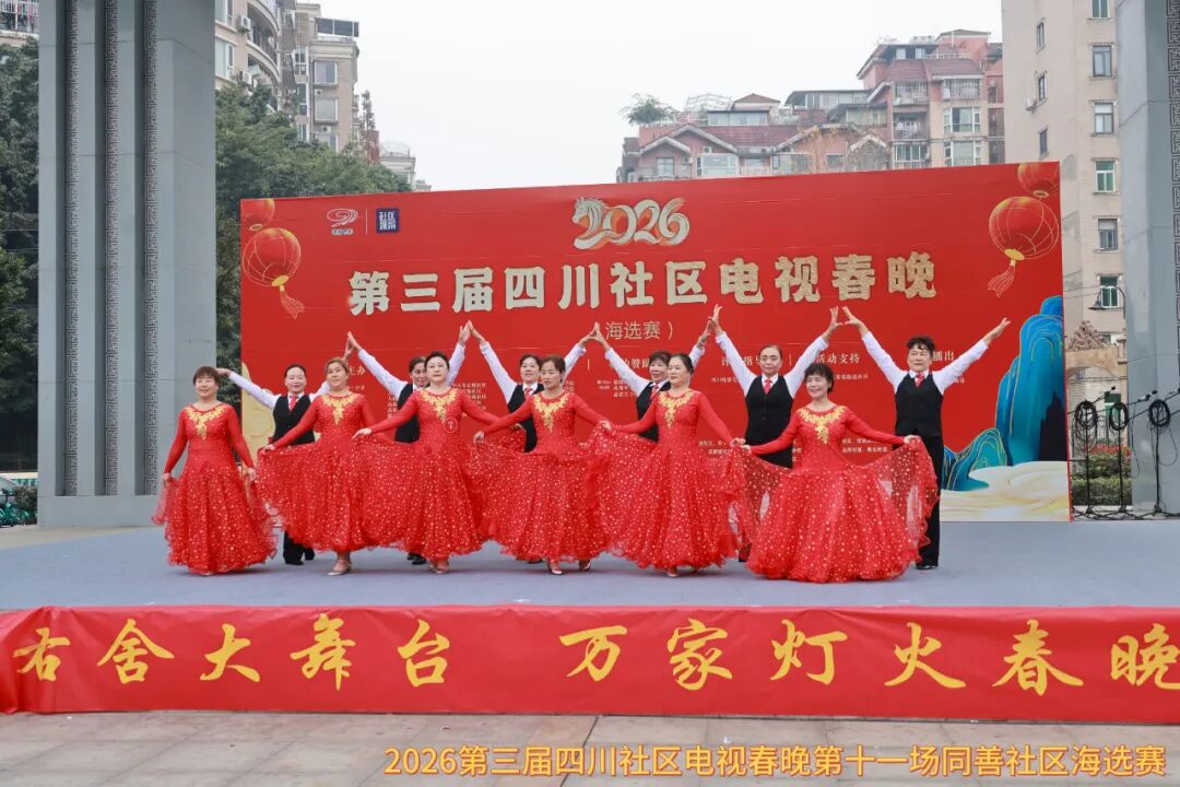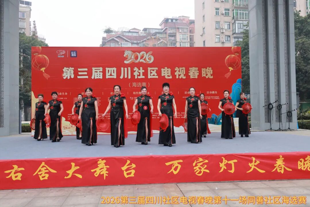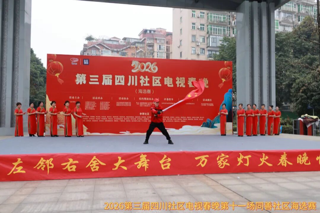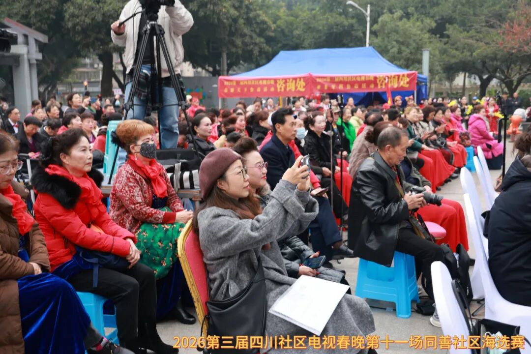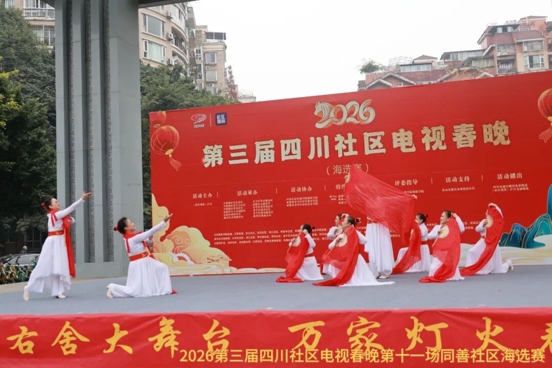 冬日的蓉城,天空虽蒙着一层薄纱,气温微寒,但人心向暖。12月19日下午,金牛区同善社区黄忠文化广场,却被一股扑面而来的热浪所包围。这里,2026第三届四川社区电视春晚第十一场社区海选赛正隆重上演。来自武侯区、锦江区、成华区和金牛区四个区域的24支优秀文艺队伍,近400名怀揣梦想的社区文艺爱好者齐聚于此。他们用歌声驱散阴霾,用舞步丈量热爱,与现场约300名社区邻里共同烹制了一席从午后延续至傍晚的文化盛宴,历时四个小时,将社区舞台的温度,烙印在每个人的心里。