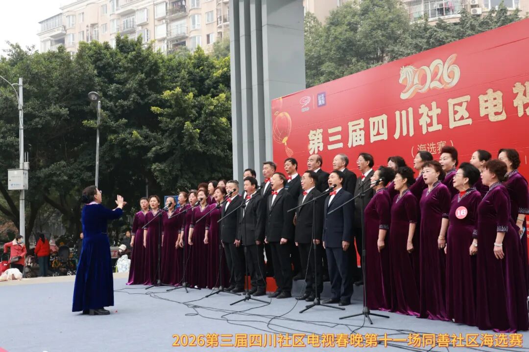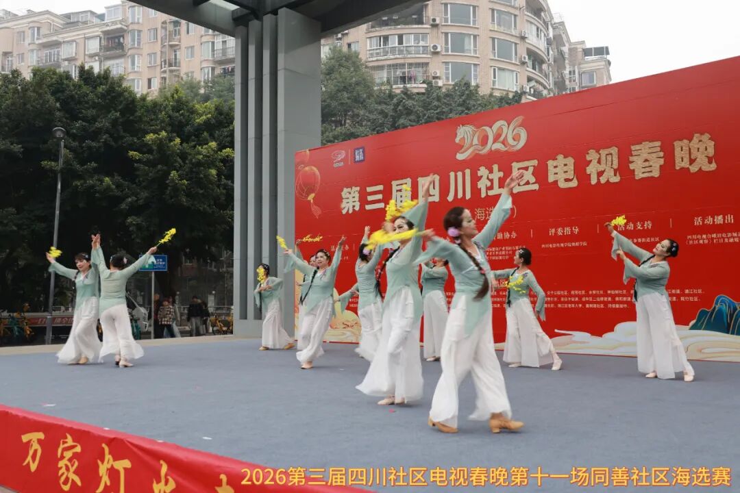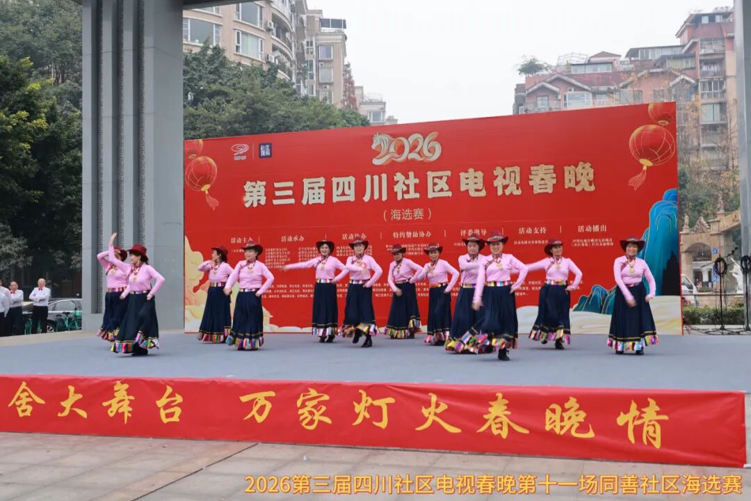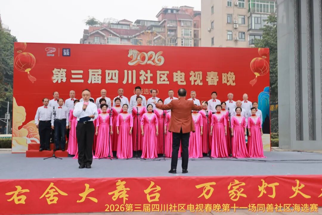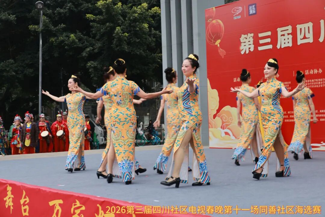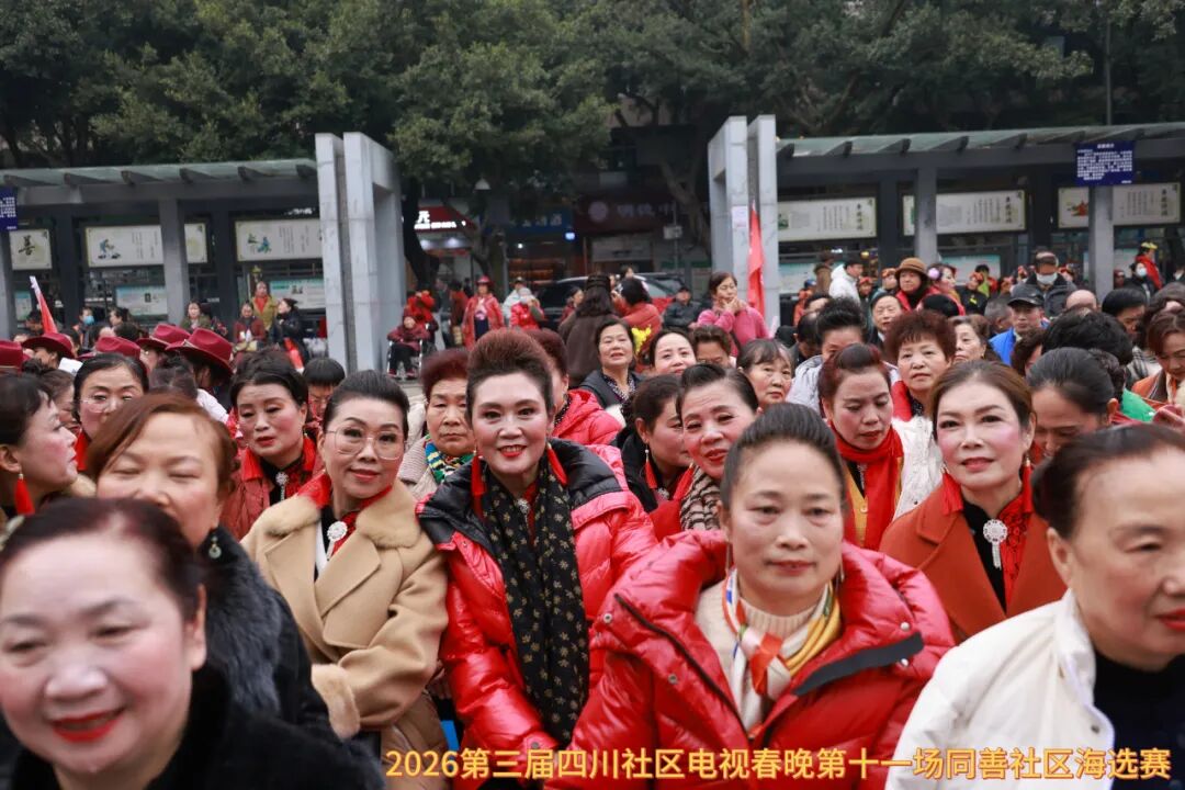 冬日的蓉城,天空虽蒙着一层薄纱,气温微寒,但人心向暖。12月19日下午,金牛区同善社区黄忠文化广场,却被一股扑面而来的热浪所包围。这里,2026第三届四川社区电视春晚第十一场社区海选赛正隆重上演。来自武侯区、锦江区、成华区和金牛区四个区域的24支优秀文艺队伍,近400名怀揣梦想的社区文艺爱好者齐聚于此。他们用歌声驱散阴霾,用舞步丈量热爱,与现场约300名社区邻里共同烹制了一席从午后延续至傍晚的文化盛宴,历时四个小时,将社区舞台的温度,烙印在每个人的心里。