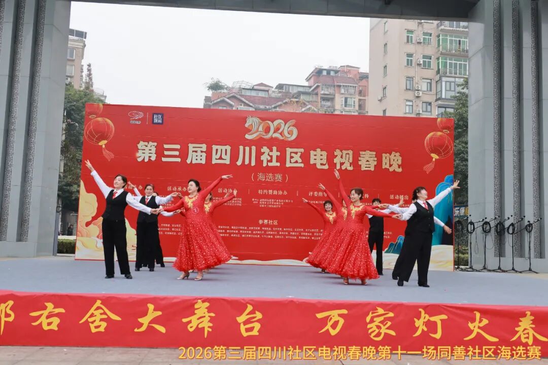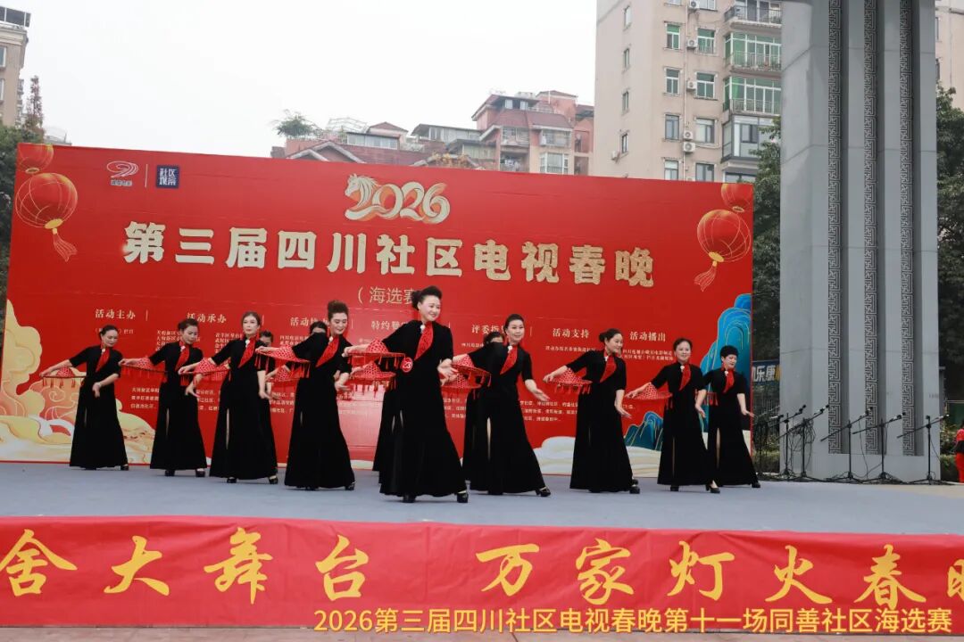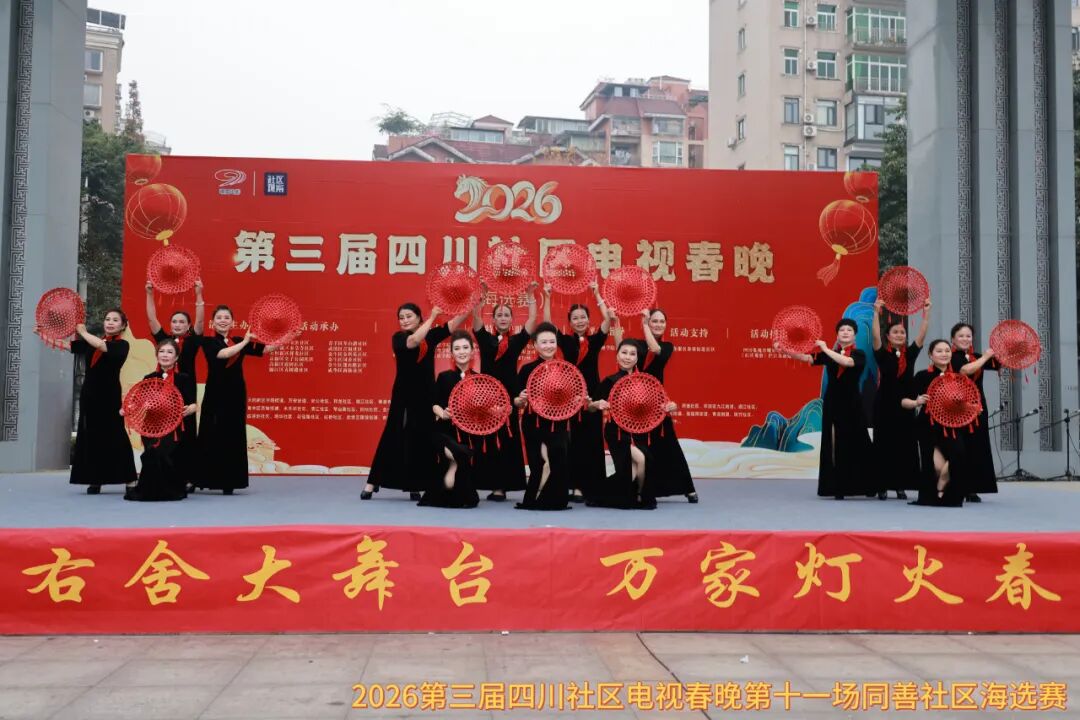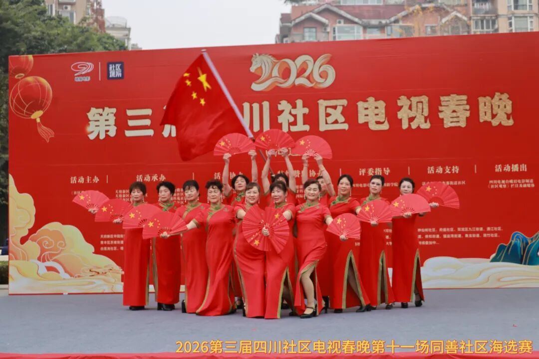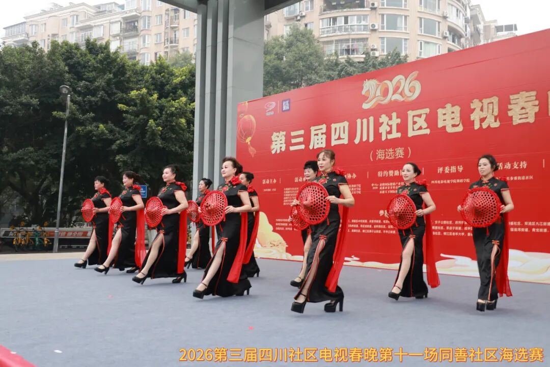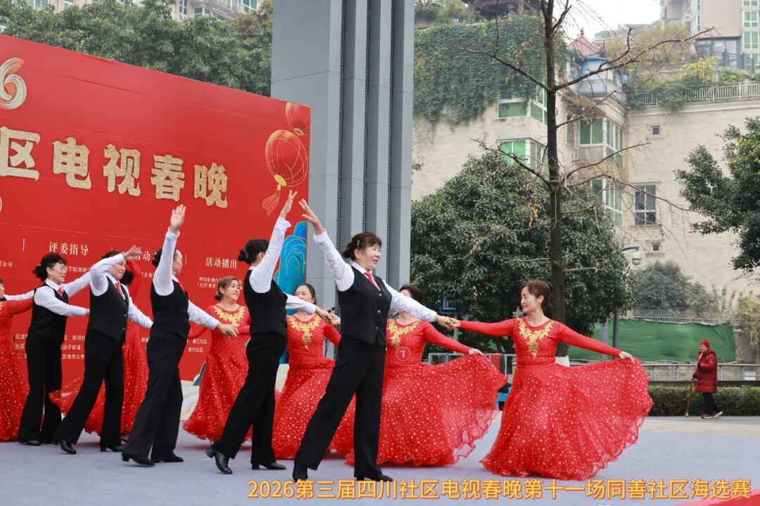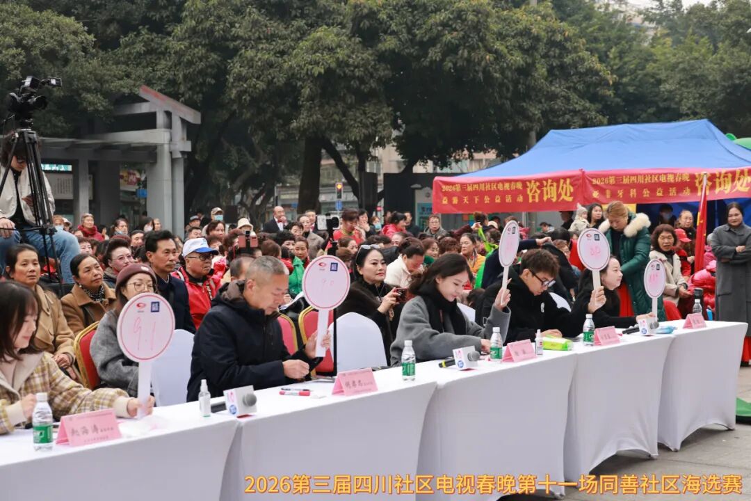 冬日的蓉城,天空虽蒙着一层薄纱,气温微寒,但人心向暖。12月19日下午,金牛区同善社区黄忠文化广场,却被一股扑面而来的热浪所包围。这里,2026第三届四川社区电视春晚第十一场社区海选赛正隆重上演。来自武侯区、锦江区、成华区和金牛区四个区域的24支优秀文艺队伍,近400名怀揣梦想的社区文艺爱好者齐聚于此。他们用歌声驱散阴霾,用舞步丈量热爱,与现场约300名社区邻里共同烹制了一席从午后延续至傍晚的文化盛宴,历时四个小时,将社区舞台的温度,烙印在每个人的心里。