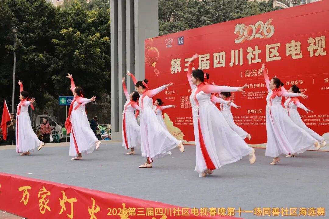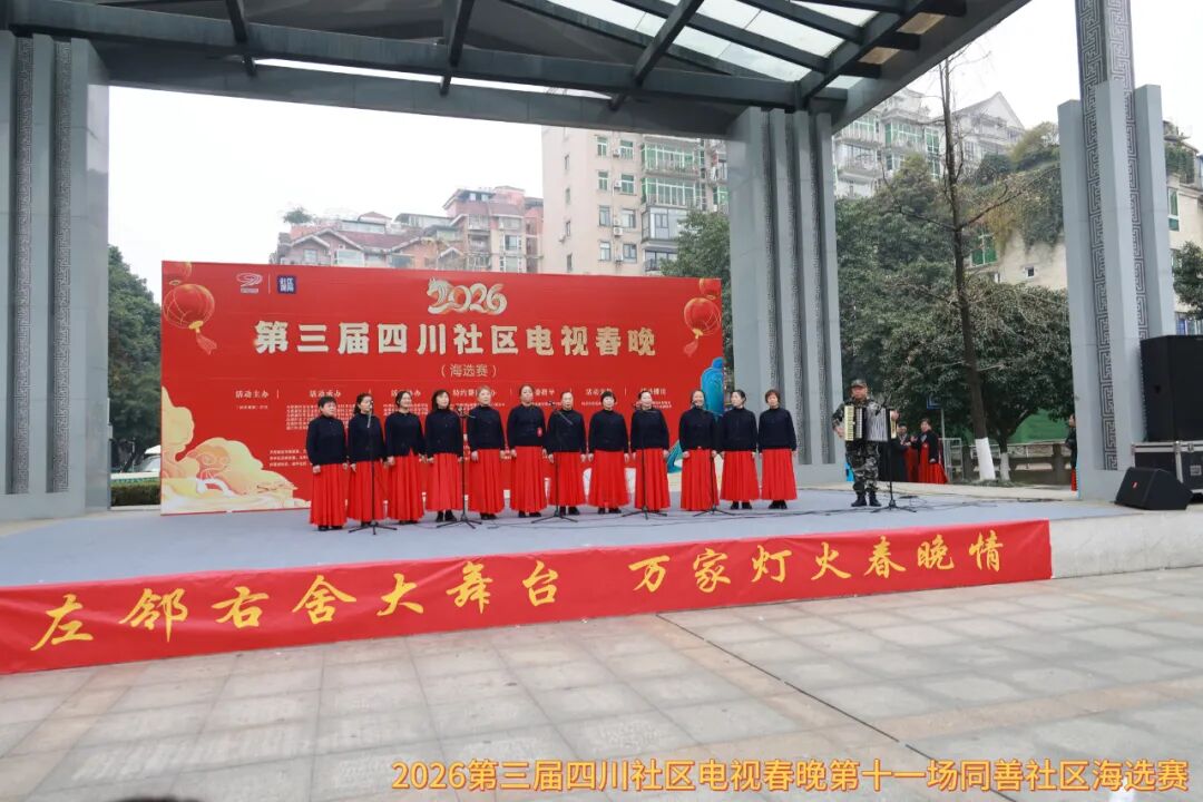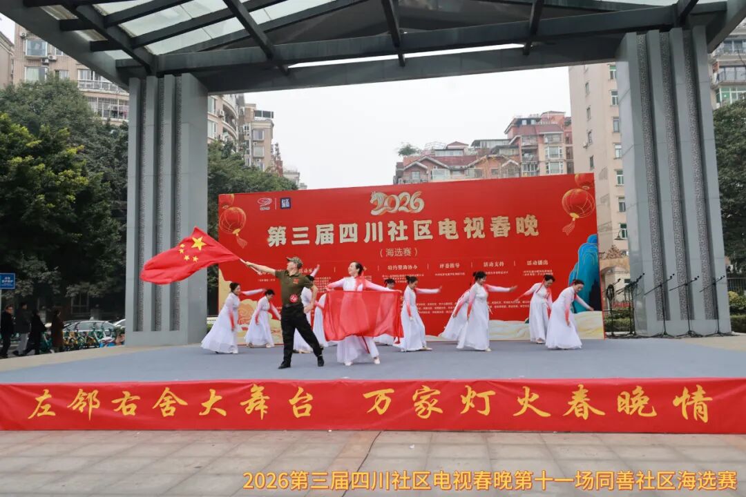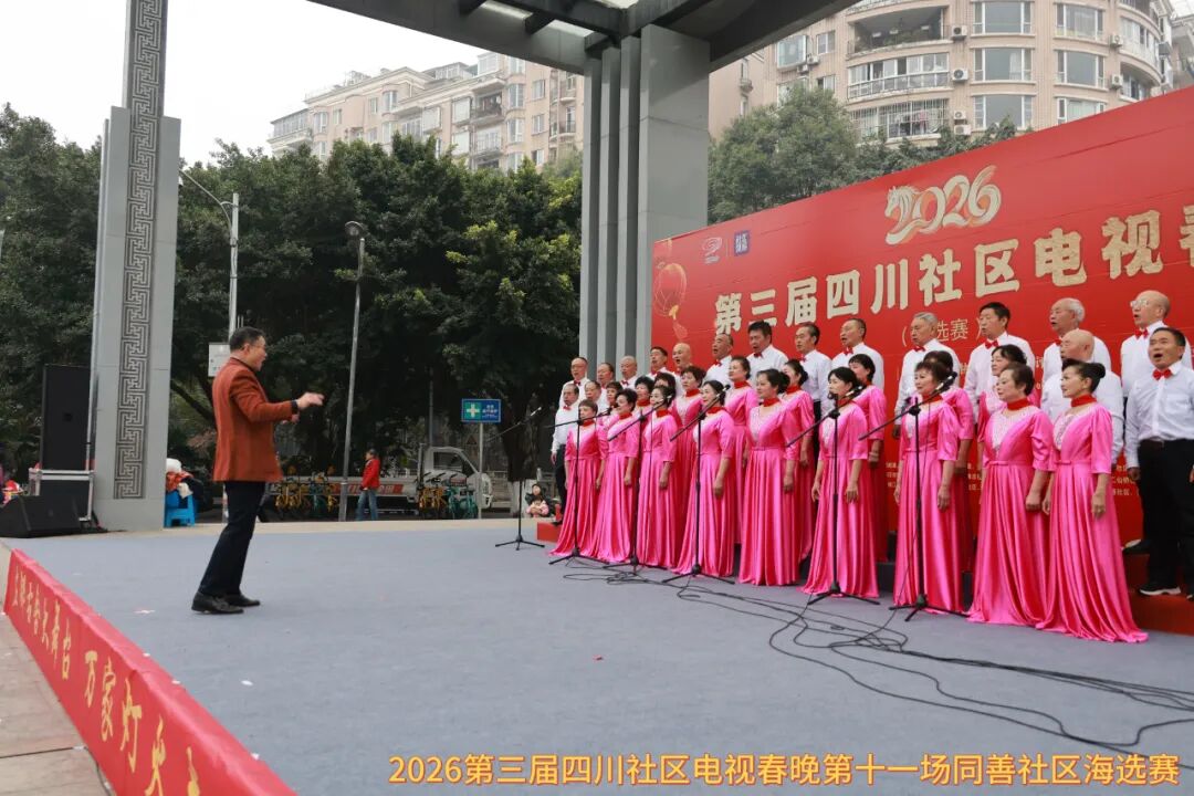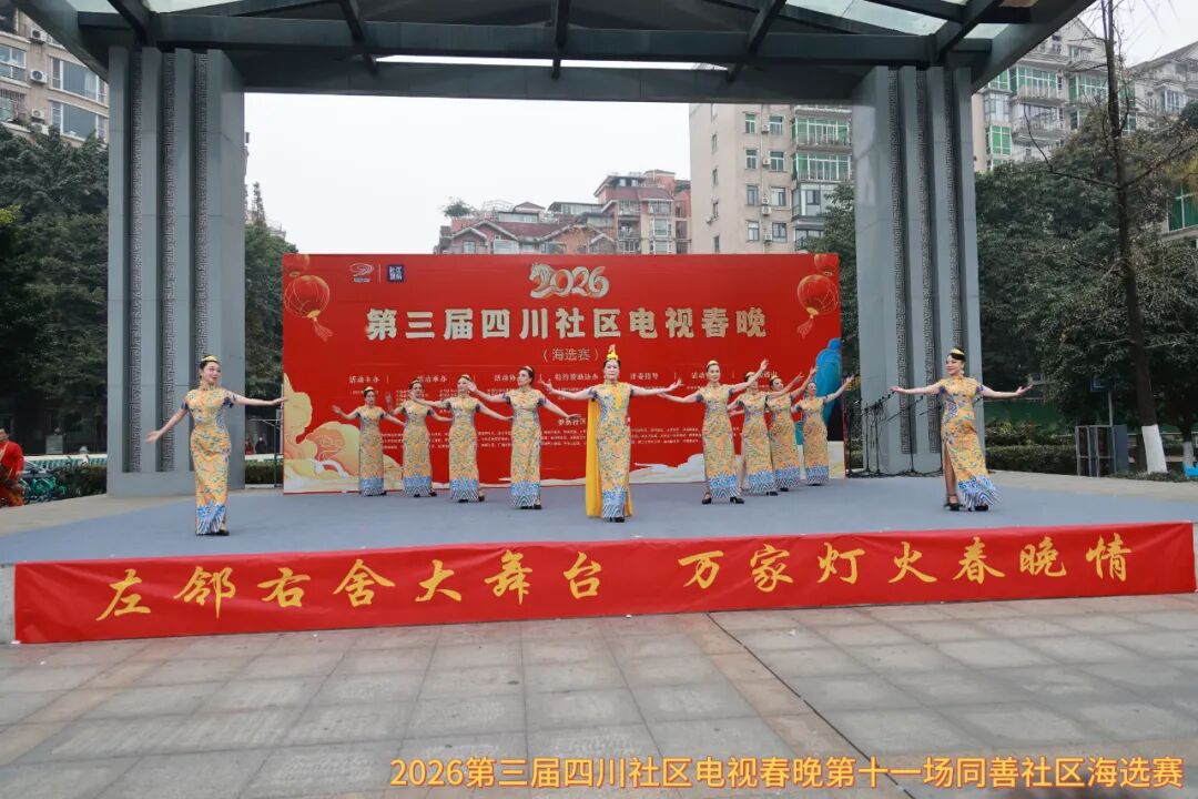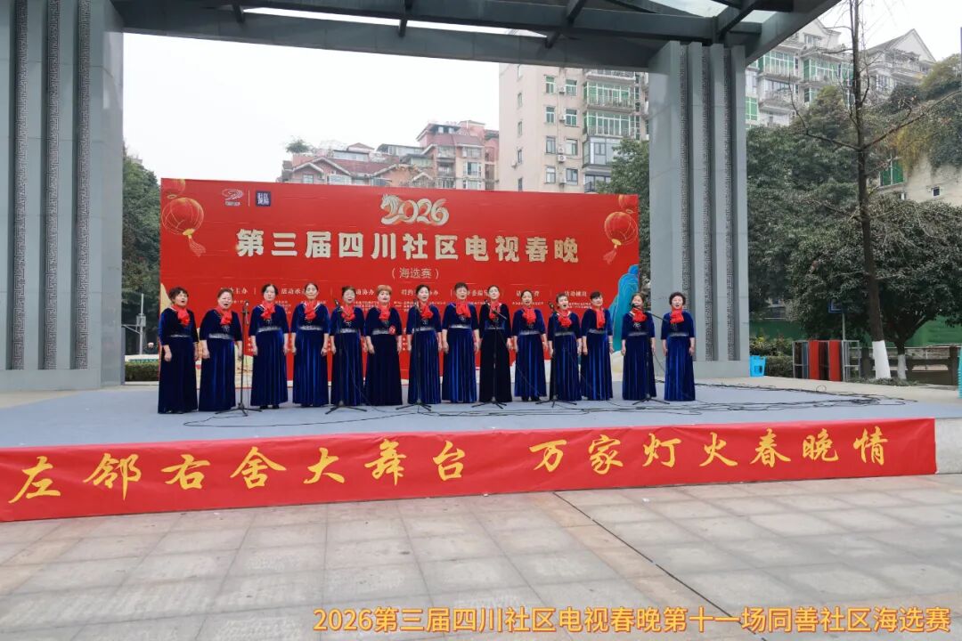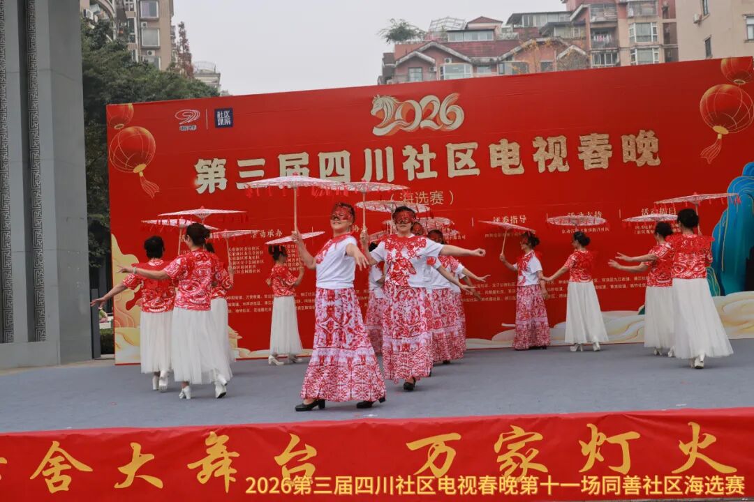 冬日的蓉城,天空虽蒙着一层薄纱,气温微寒,但人心向暖。12月19日下午,金牛区同善社区黄忠文化广场,却被一股扑面而来的热浪所包围。这里,2026第三届四川社区电视春晚第十一场社区海选赛正隆重上演。来自武侯区、锦江区、成华区和金牛区四个区域的24支优秀文艺队伍,近400名怀揣梦想的社区文艺爱好者齐聚于此。他们用歌声驱散阴霾,用舞步丈量热爱,与现场约300名社区邻里共同烹制了一席从午后延续至傍晚的文化盛宴,历时四个小时,将社区舞台的温度,烙印在每个人的心里。