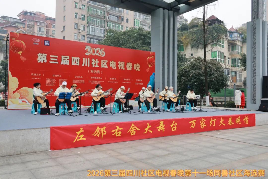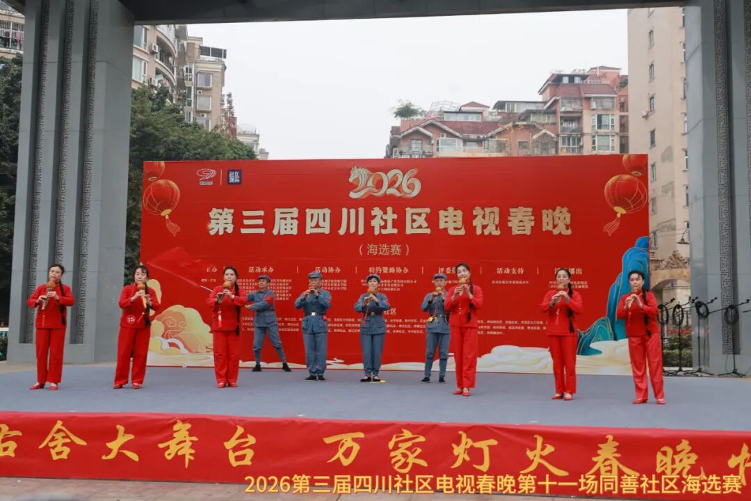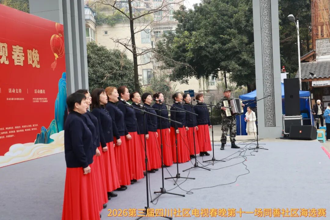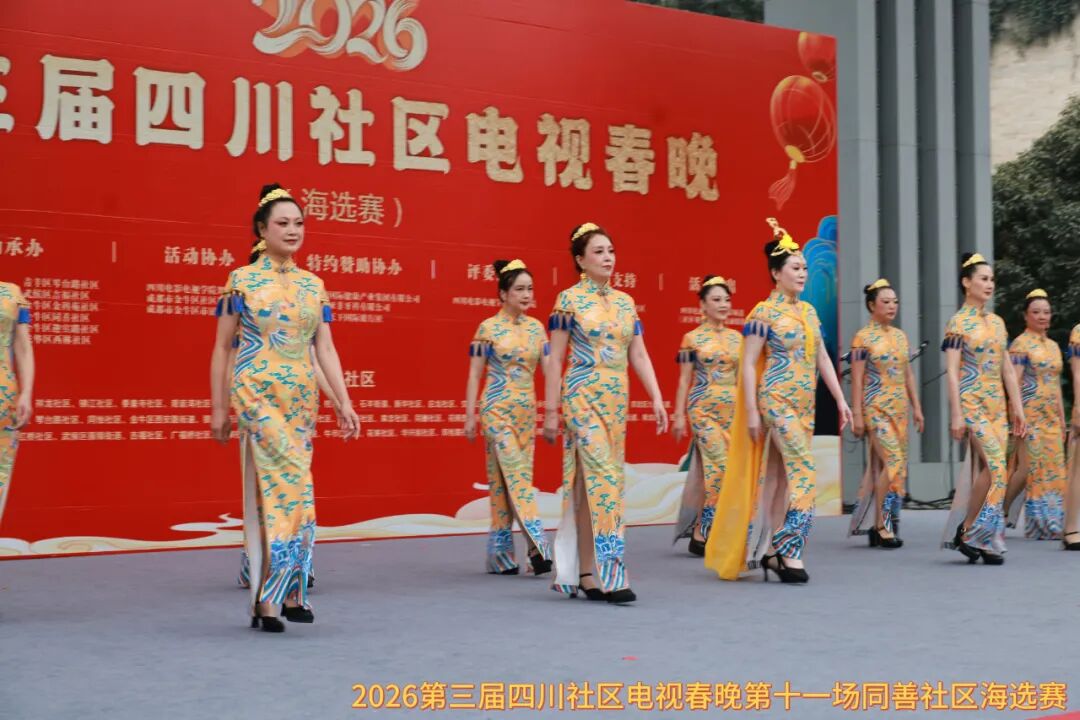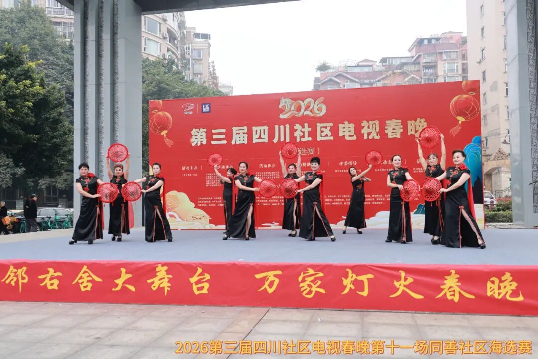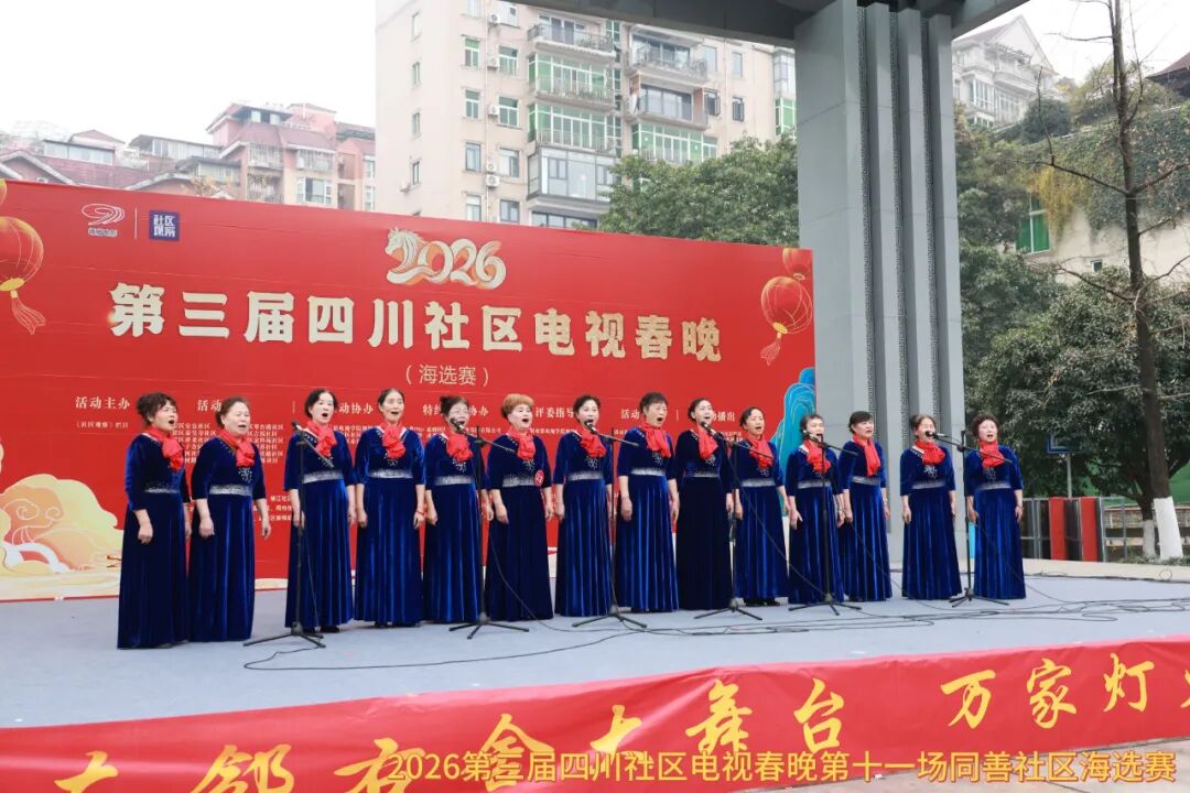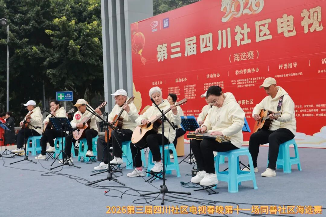 冬日的蓉城,天空虽蒙着一层薄纱,气温微寒,但人心向暖。12月19日下午,金牛区同善社区黄忠文化广场,却被一股扑面而来的热浪所包围。这里,2026第三届四川社区电视春晚第十一场社区海选赛正隆重上演。来自武侯区、锦江区、成华区和金牛区四个区域的24支优秀文艺队伍,近400名怀揣梦想的社区文艺爱好者齐聚于此。他们用歌声驱散阴霾,用舞步丈量热爱,与现场约300名社区邻里共同烹制了一席从午后延续至傍晚的文化盛宴,历时四个小时,将社区舞台的温度,烙印在每个人的心里。