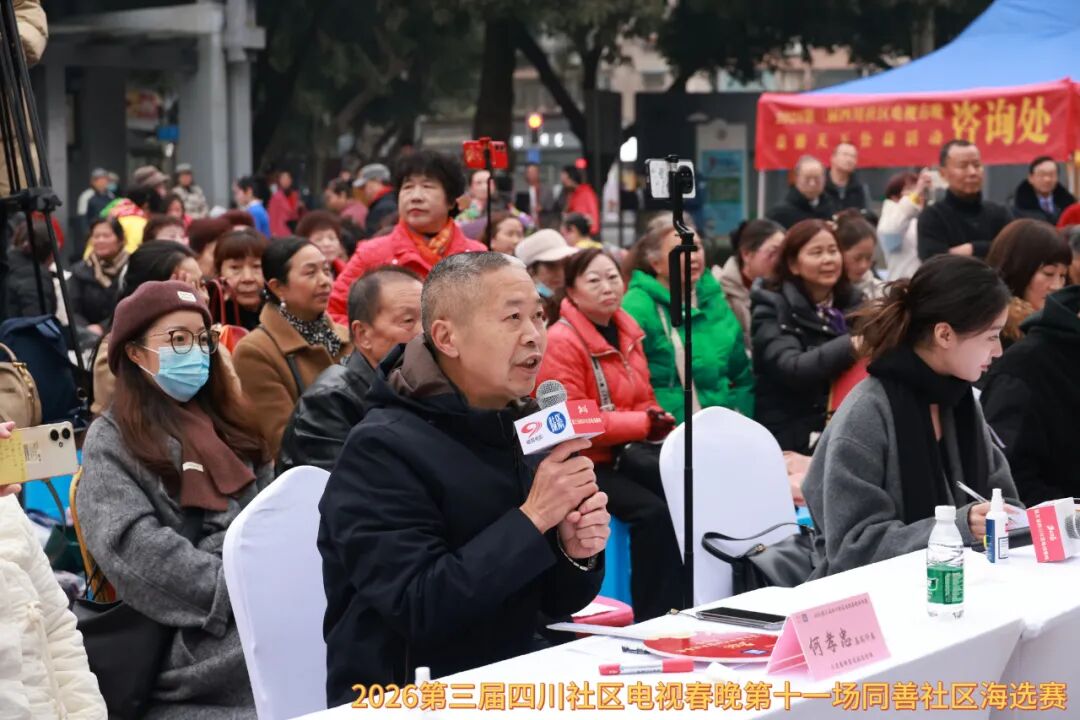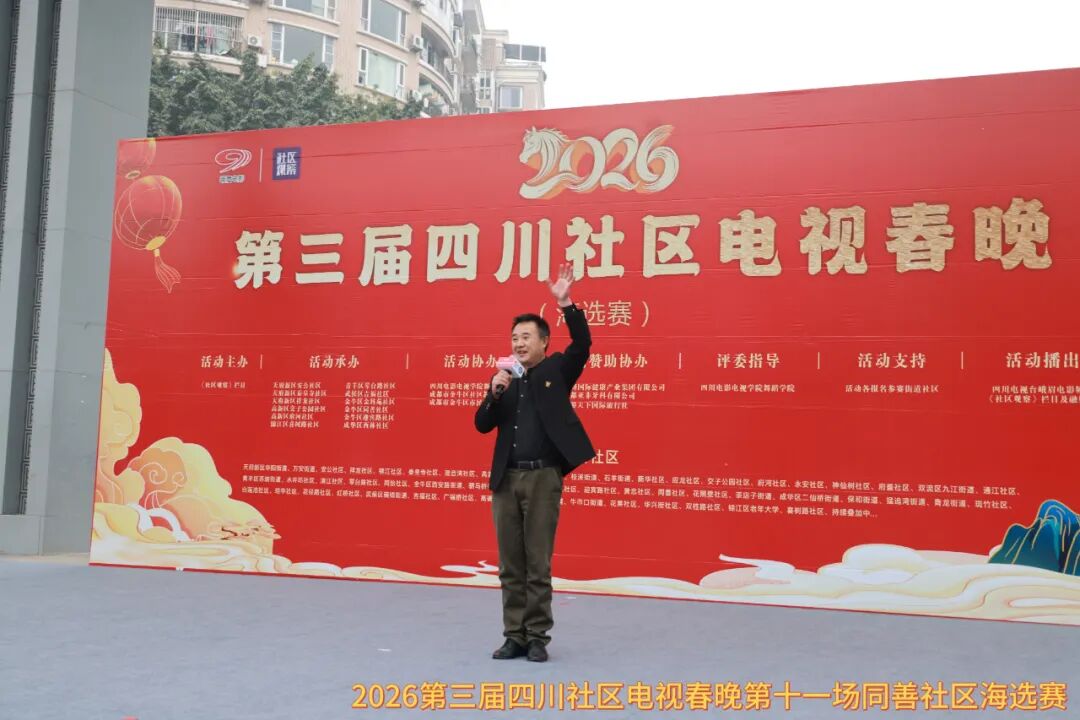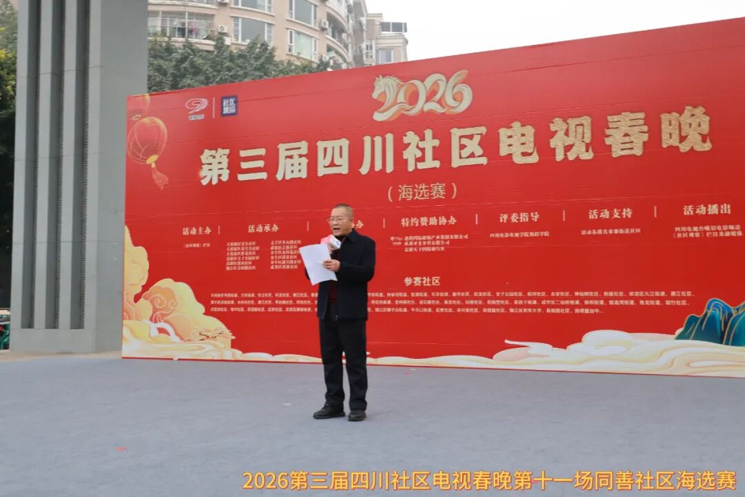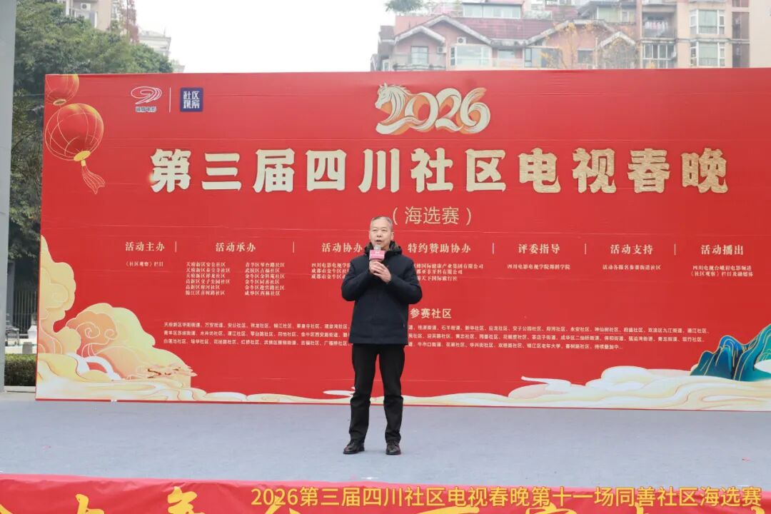 作为本场海选赛的东道主,成都市金牛区茶店子街道同善社区党委李代根书记发表了热情洋溢的讲话。李书记首先热烈欢迎四川社区电视春晚这一品牌社区IP年度活动落地同善社区。他动情地说:“今天来到现场的每一支队伍,都是我们各个社区的骄傲与名片。社区党委、居委始终致力于为居民的文化生活创造条件、做好服务。本次海选赛在家门口举办,就是为了让更多居民能够便捷地参与、观赏到高水平的文艺演出,充分展现我们新时代社区居民积极向上、团结和睦的精神风貌。我宣布,2026第三届四川社区电视春晚第十一场海选赛,现在开幕!”