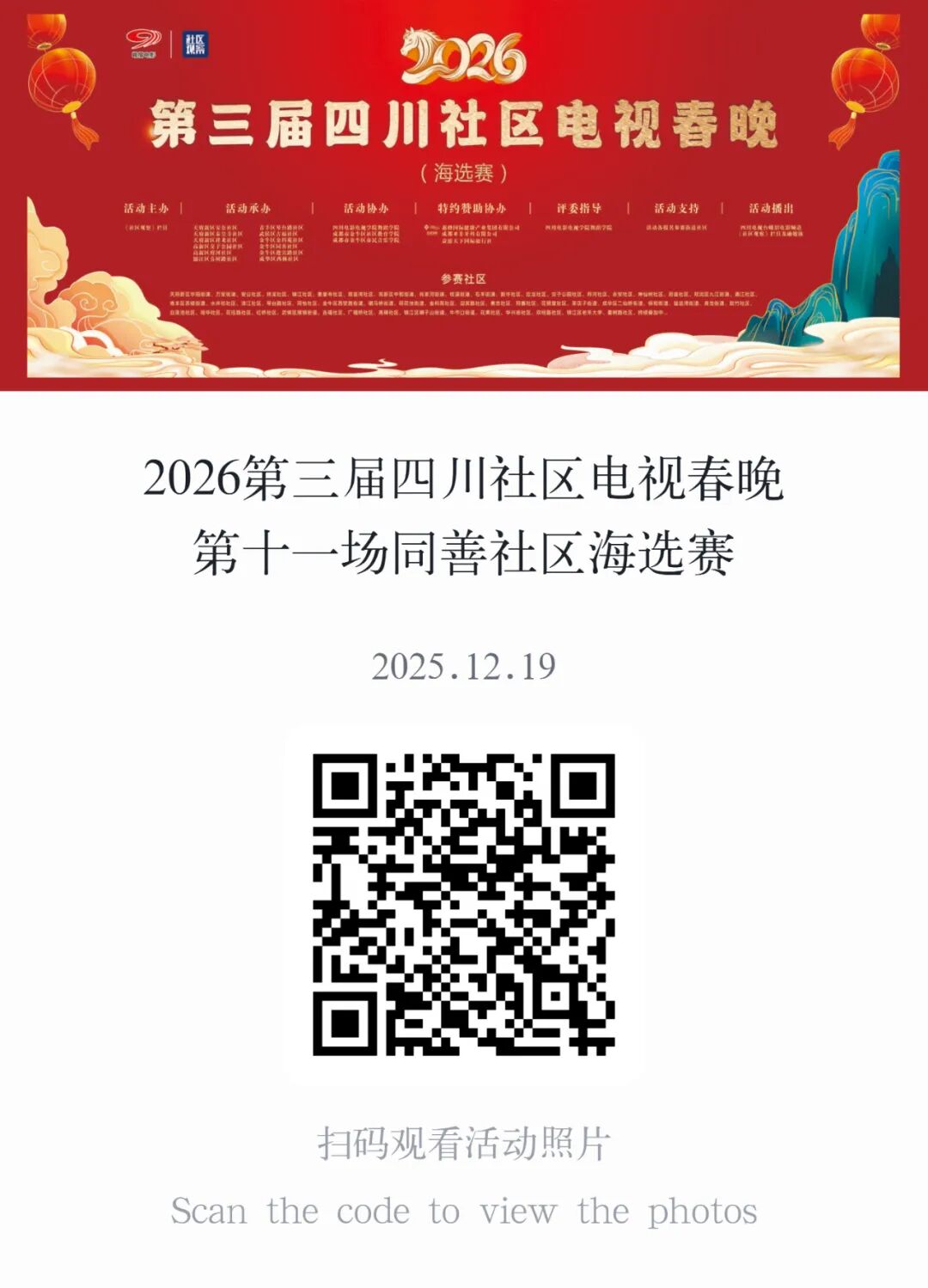 今日同善,明日同庆。2026第三届四川社区电视春晚,总决赛见!12月26日,锦江区喜树路社区,我们不见不散!